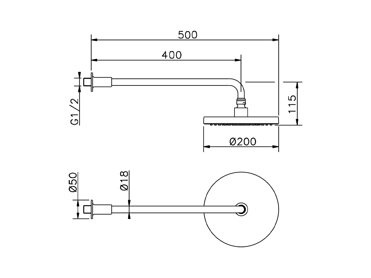 Braccio doccia con soffione,soffione tondo D.200 mm sp.11,5 mm in ABS,braccio doccia L.400 mm
