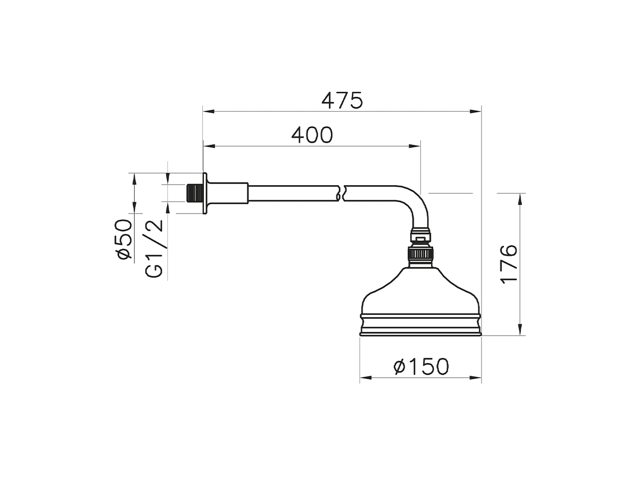 Braccio doccia con soffione VT-CS,soffione tondo D.150 mm in Ottone,braccio doccia L.400 mm