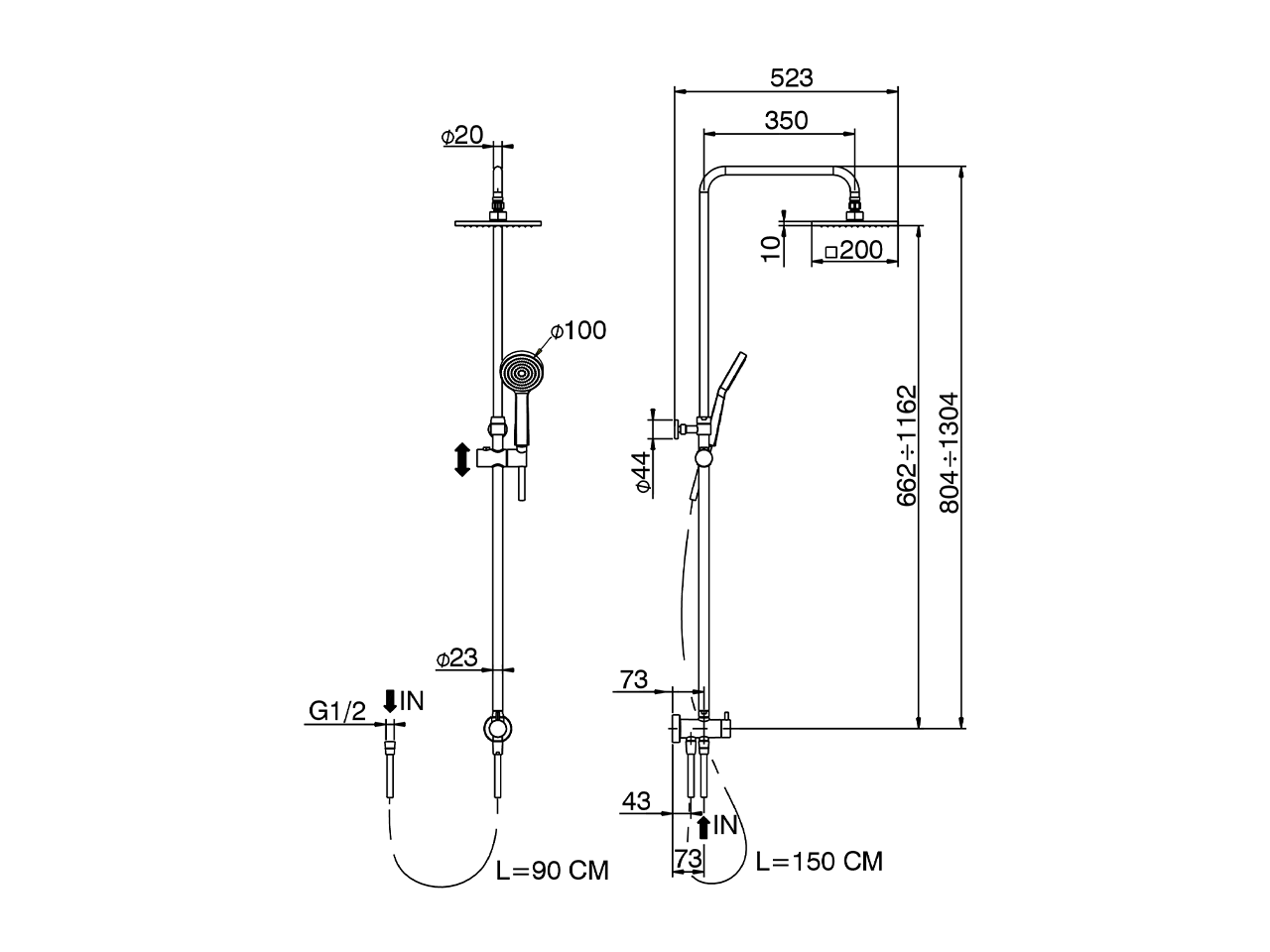 Colonna doccia con deviatore,deviatore 2 uscite con presa acqua esterna,colonna telescopica,supporto doccetta scorrevole,doccetta monogetto Melody D.100 mm,soffione quadro 200x200 mm sp.11,5 mm in ABS,dupla 90-150 cm rozsdam.