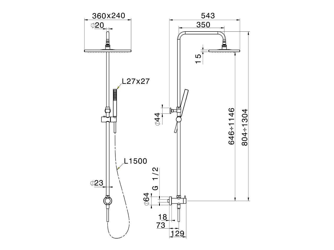 Colonna doccia con deviatore,deviatore 2 uscite con presa acqua incasso,colonna telescopica,supporto doccetta scorrevole,doccetta monogetto minimalista quadra 27x27 mm ABS,soffione rettangolare 240x360 sp.15 mm,flessibile liscio SILVERFLEX 150 cm