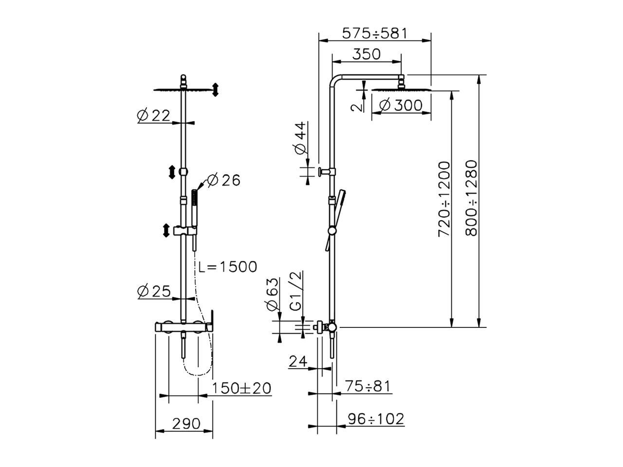 Colonna doccia monocomando 2 funzioni,deviastop 2 uscite,colonna telescopica,supporto doccetta scorrevole,doccetta monogetto minimalista in ABS D.26 mm,soffione tondo D.300 mm sp.2 mm in INOX,flessibile liscio SILVERFLEX 150 cm