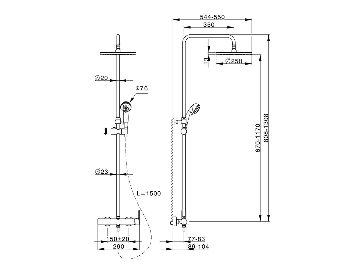Colonna doccia monocomando 2 funzioni,deviatore 2 uscite,colonna telescopica,supporto doccetta scorrevole,doccetta Teti 3 getti in ABS,soffione tondo D.250 mm sp.14 mm in ABS,flex PVC 150 cm