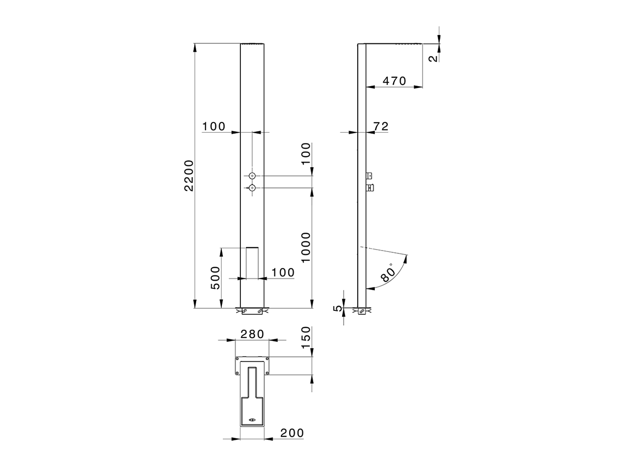 Colonna doccia monocomando,deviatore 2 uscite,per esterno/interno a pavimento,soffione rettangolare 200x470 sp.2 mm Inox,con valvola di sicurezza brevettata,funzioni pioggia, cascata,Inox AISI 316L