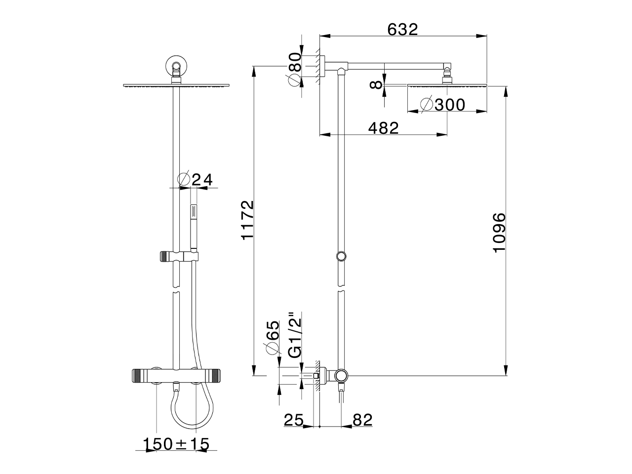 Colonna doccia termostatica 2 funzioni,deviastop 2 uscite,colonna fissa,supporto doccetta scorrevole,doccetta monogetto minimale D.24mm in Ottone,soffione tondo D.300 mm sp.