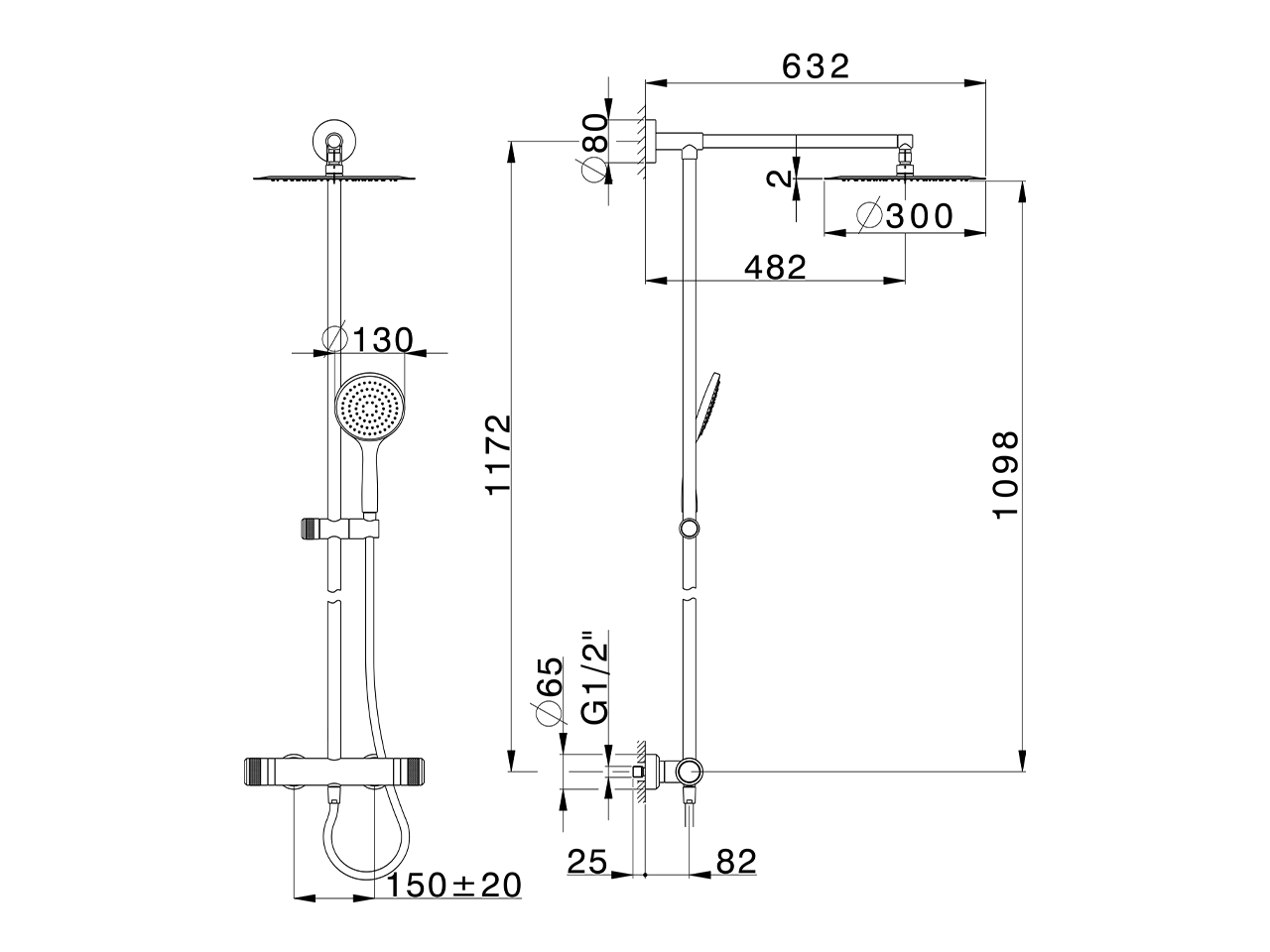 Colonna doccia termostatica 2 funzioni,deviastop 2 uscite,colonna fissa,supporto doccetta scorrevole,doccetta monogetto Emotion D.130 mm in ABS,soffione tondo D.300 mm in INOX,flessibile liscio SUPREME 150 cm