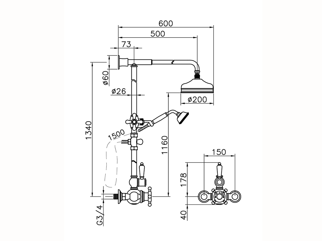 Colonna doccia termostatica 2 funzioni,deviatore 2 uscite,colonna fissa,supporto doccetta scorrevole,doccetta monogetto Classica D.78 mm in Ottone,soffione tondo D.200 mm in Ottone,flex Ottone 150 cm