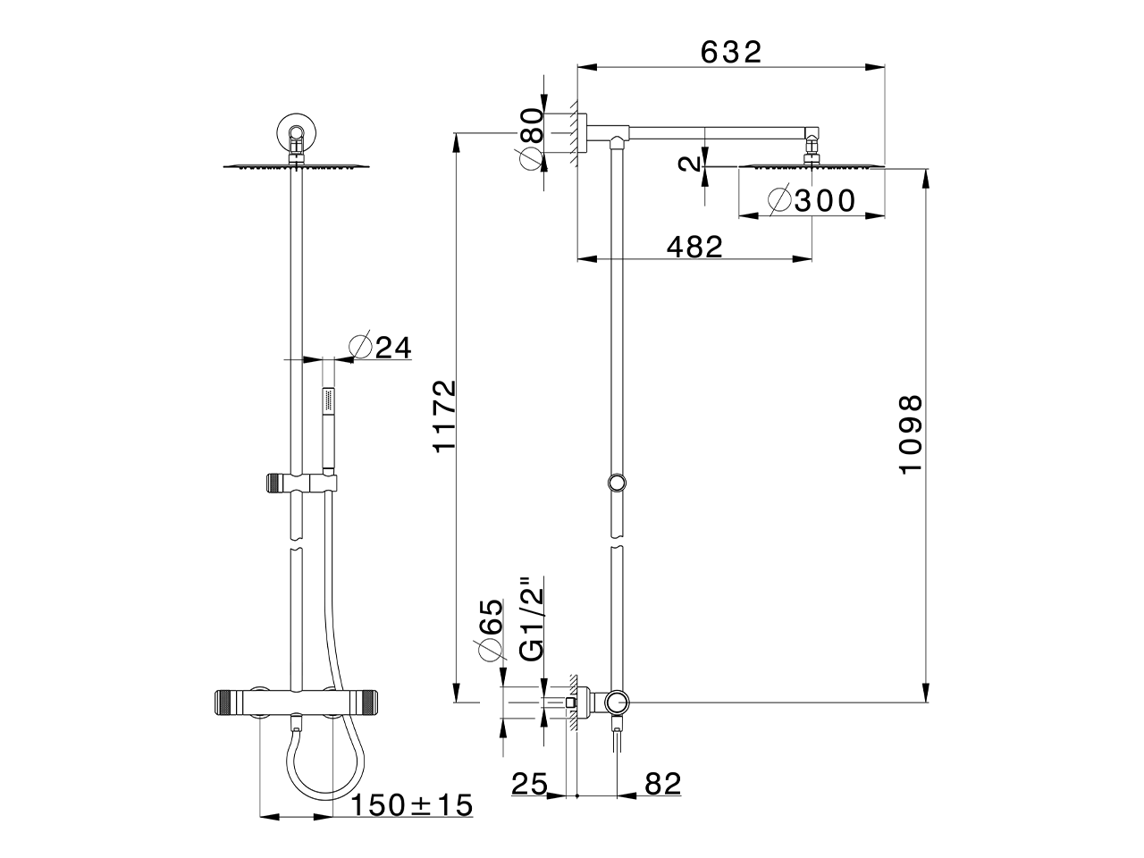 Colonna doccia termostatica 2 funzioni,deviastop 2 uscite,colonna fissa,supporto doccetta scorrevole,doccetta monogetto minimale D.24mm in Ottone,soffione tondo D.300 mm in INOX,flessibile liscio SUPREME 150 cm