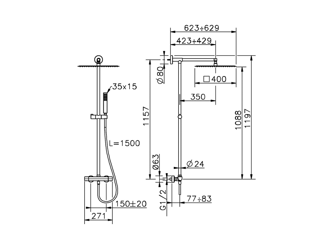 Colonna doccia termostatica 2 funzioni,deviastop 2 uscite,colonna fissa,supporto doccetta scorrevole,doccetta monogetto minimalista 35x15 mm Ottone,soffione quadro 400x400 mm sp.2 mm in INOX,flessibile liscio SUPREME 150 cm