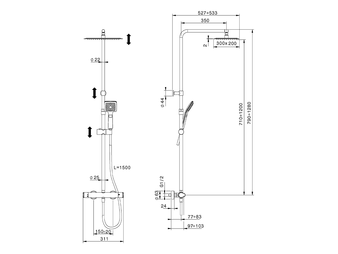 Colonna doccia termostatica 2 funzioni,deviastop 2 uscite,colonna telescopica,supporto doccetta scorrevole,doccetta 3 getti 96x96 mm ABS,soffione rettangolare 300x200 sp.2 mm Inox,flessibile liscio SUPREME 150 cm
