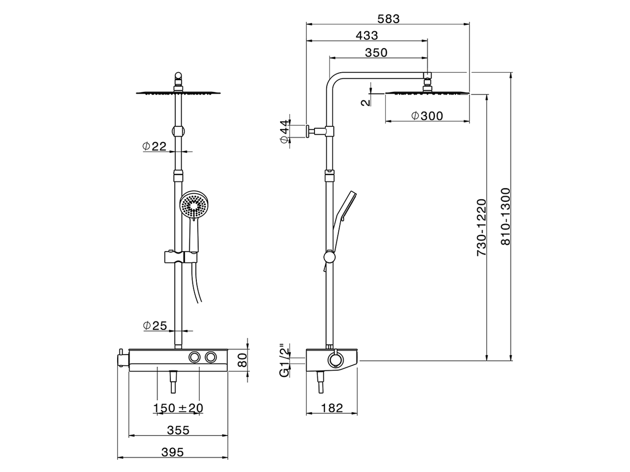 Colonna doccia termostatica 2 funzioni,deviastop 2 uscite a pulsante,colonna telescopica,supporto doccetta scorrevole,doccetta 3 getti Lodge D.100 mm in ABS,soffione tondo D.300 mm sp.2 mm in INOX,flessibile liscio SILVERFLEX 150 cm