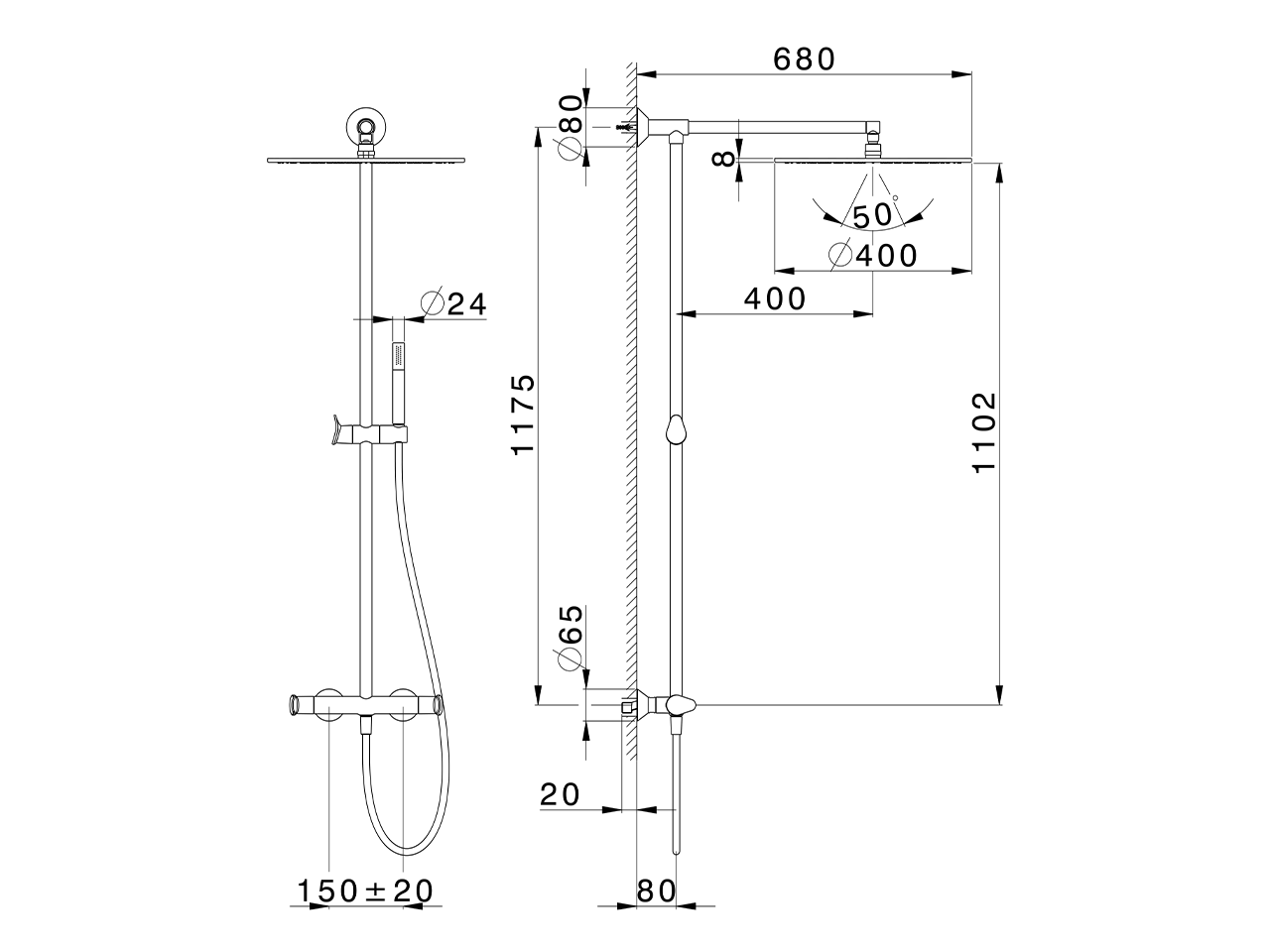 Colonna doccia termostatica 2 funzioni,deviastop 2 uscite,colonna fissa,supporto doccetta scorrevole in Ottone,doccetta monogetto minimale in Ottone,soffione tondo D.400 mm in Ottone,flessibile liscio SUPREME 150 cm