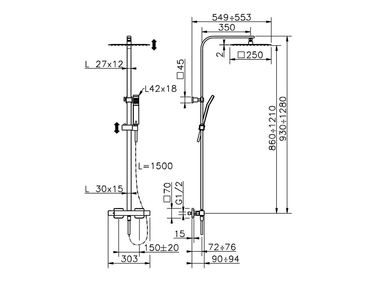 Colonna doccia termostatica 2 funzioni,deviastop 2 uscite,colonna telescopica,supporto doccetta scorrevole,doccetta monogetto Quad 42x18 mm in ABS,soffione quadro 250x250 mm sp.2 mm in INOX,flessibile liscio SILVERFLEX 150 cm