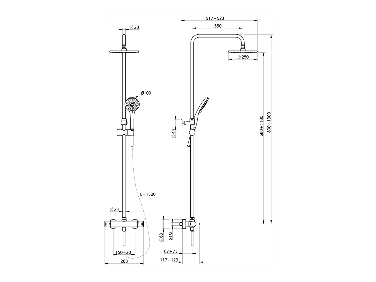 Colonna doccia termostatica 2 funzioni,deviastop 2 uscite,colonna telescopica,supporto doccetta scorrevole,doccetta 3 getti D.100 mm ABS,soffione tondo D.250 mm sp.8 mm in OTTONE,flessibile liscio SILVERFLEX 150 cm
