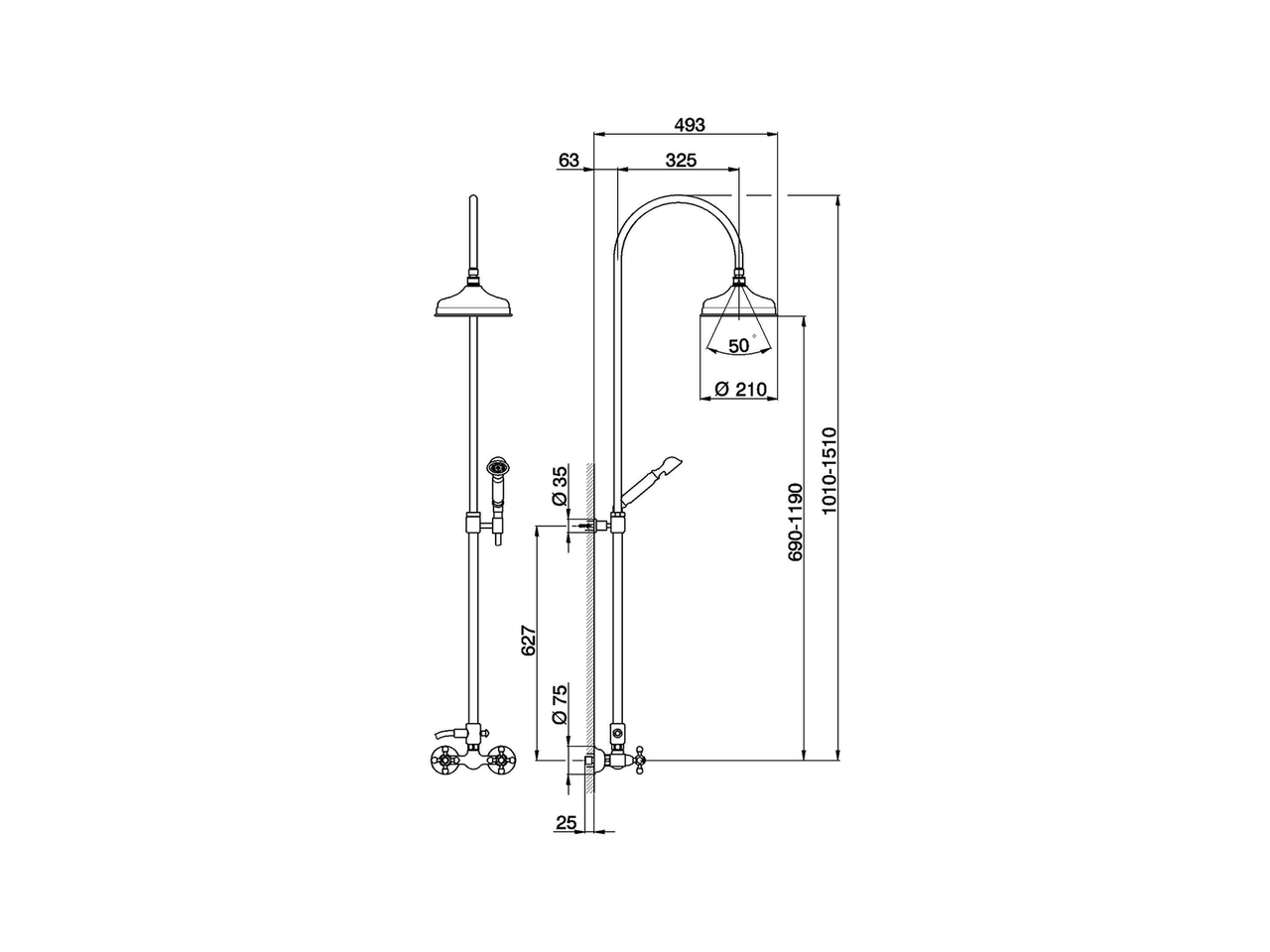 Colonna miscelatore doccia 2 funzioni,deviatore 2 uscite,colonna telescopica,con supporto doccetta fisso,doccetta monogetto Classica D.53 mm in Ottone,soffione tondo D.210 mm in Ottone,flex Ottone 150 cm