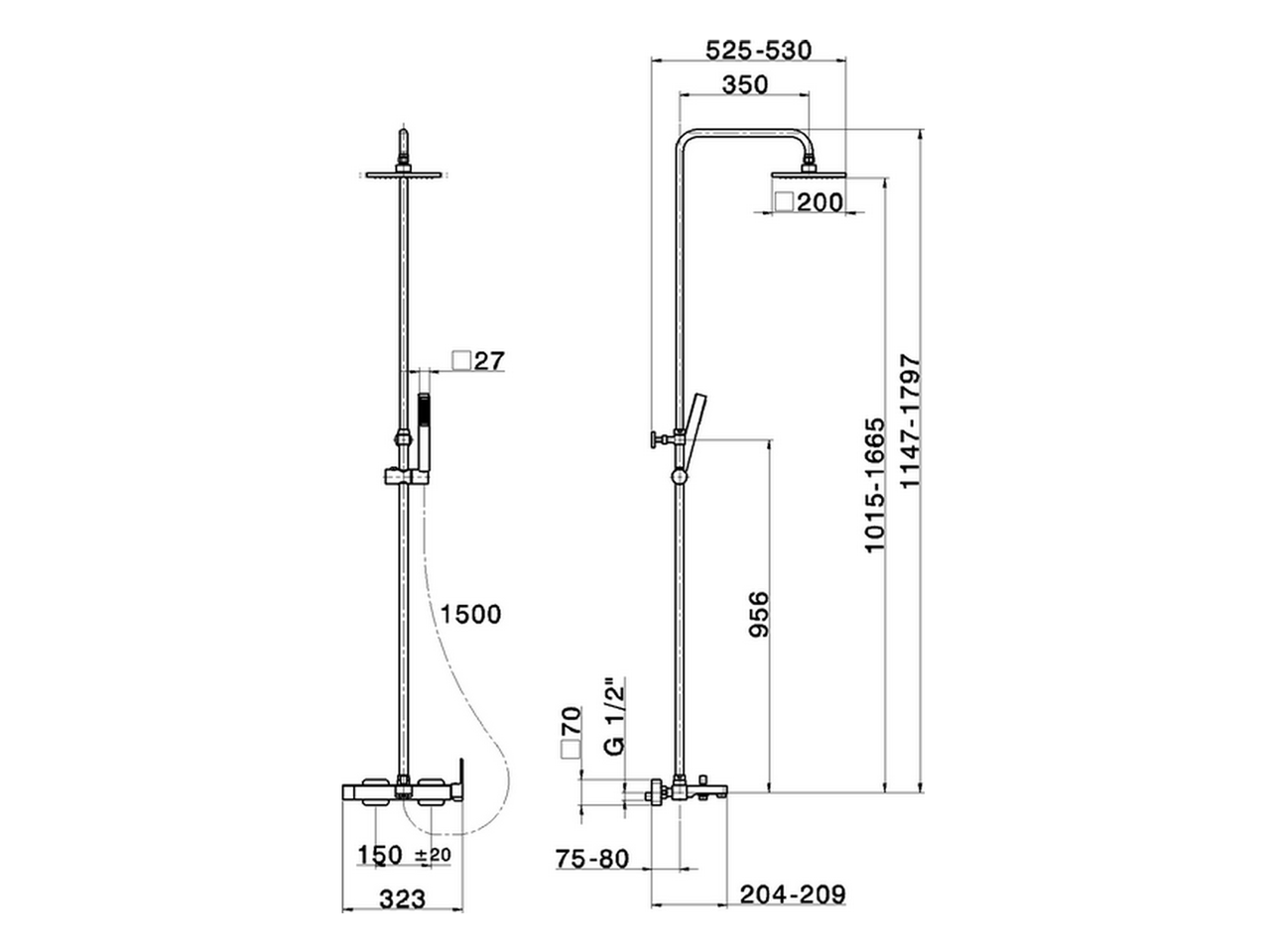 Colonna vasca monocomando 3 funzioni,deviastop 2 uscite,colonna telescopica,supporto doccetta scorrevole,doccetta monogetto minimalista quadra 27x27 mm ABS,soffione quadro 200x200 mm in ABS,flessibile liscio SILVERFLEX 150 cm