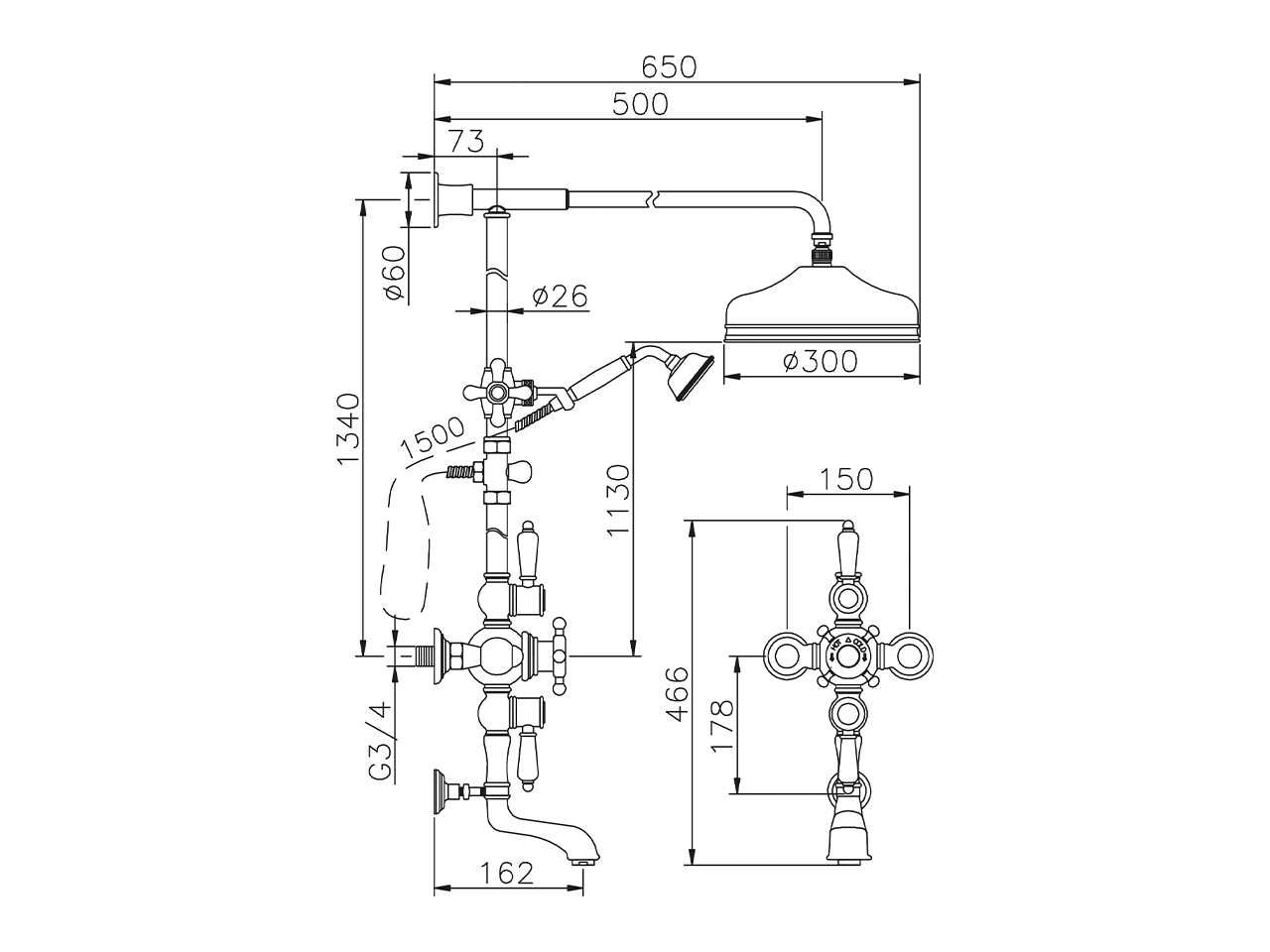 Colonna vasca termostatica 3 funzioni,deviatore 2 uscite,colonna fissa,2 rubinetti d'arresto,supporto doccetta scorrevole,doccetta monogetto Classica D.78 mm in ottone,soffione tondo D.300 mm in Ottone,flex Ottone 150 cm