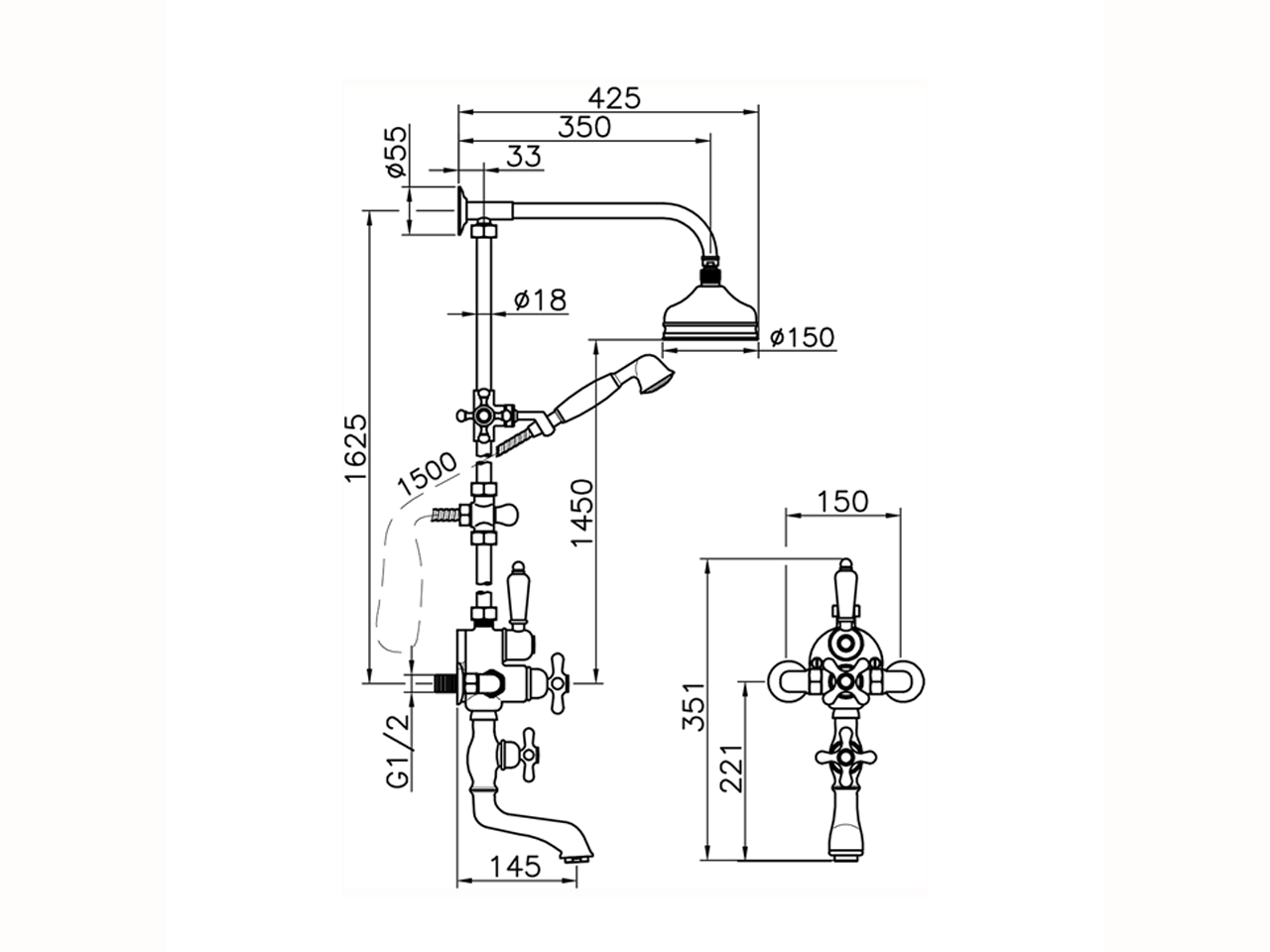 Colonna vasca termostatica 3 funzioni,deviatore 2 uscite,colonna fissa,2 rubinetti d'arresto,supporto doccetta scorrevole,doccetta monogetto Classica D.53 mm in ottone,soffione tondo D.150 mm in Ottone,flex Ottone 150 cm