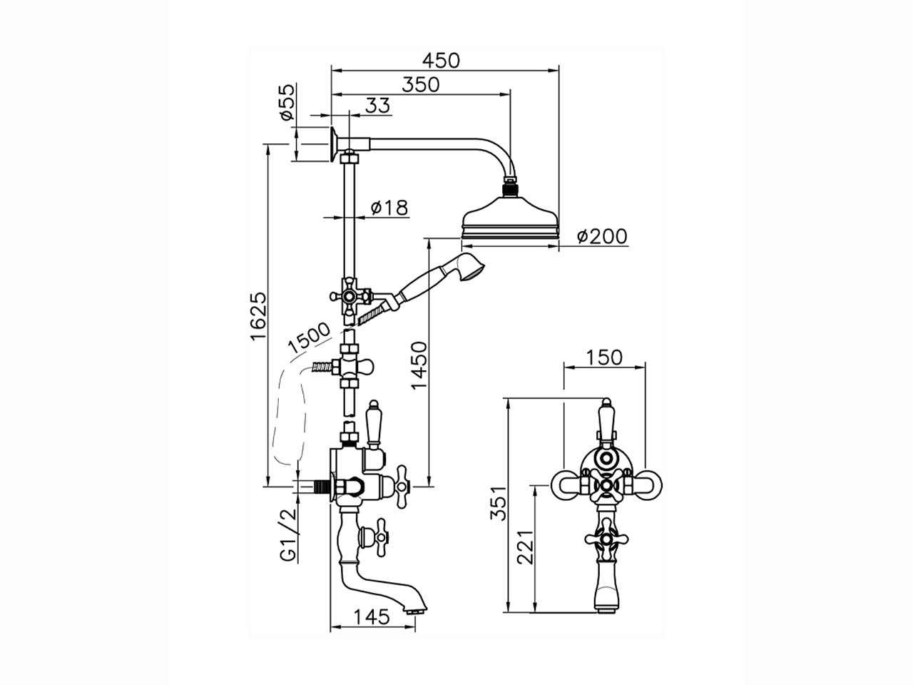 Colonna vasca termostatica 3 funzioni,deviatore 2 uscite,colonna fissa,2 rubinetti d'arresto,supporto doccetta scorrevole,doccetta monogetto Classica D.53 mm in ottone,soffione tondo D.200 mm in Ottone,flex Ottone 150 cm