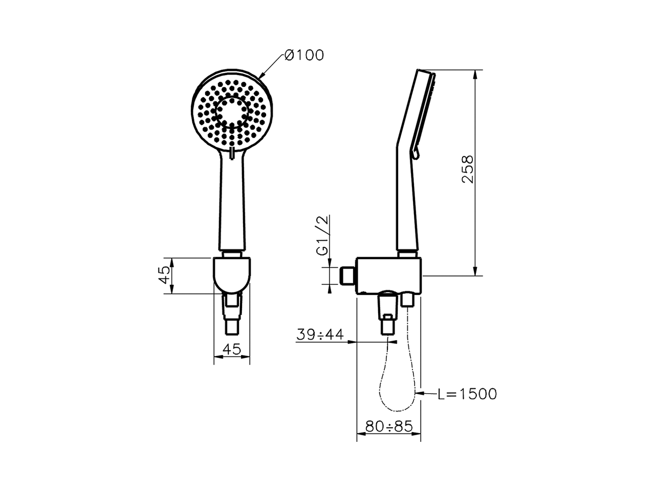 Completo doccia con presa d'acqua,supporto fisso murale con raccordo 1/2",doccetta 3 getti Lodge D.100 mm in ABS,flessibile liscio SUPREME 150 cm