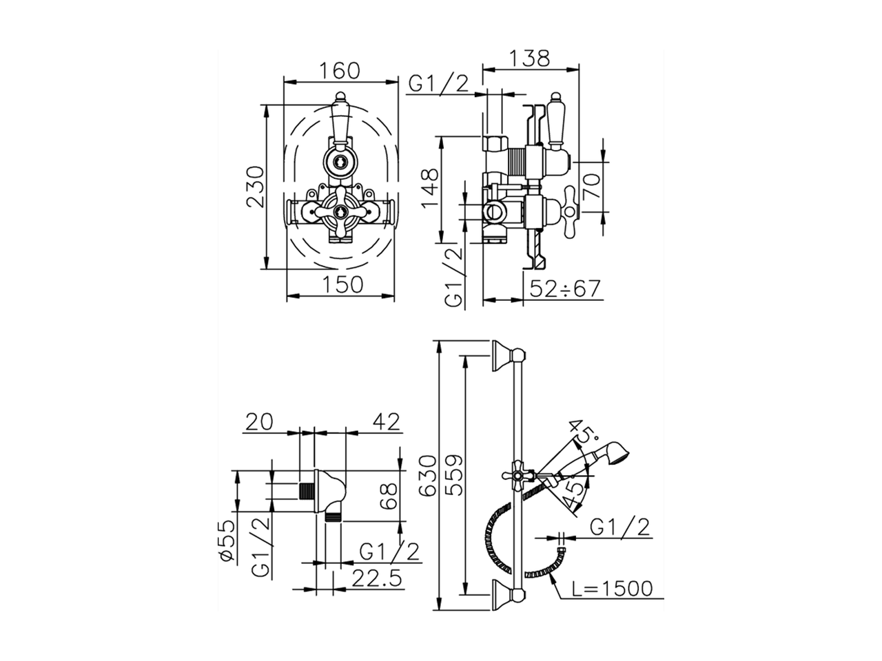 Completo miscelatore termostatico doccia incasso,miscelatore termostatico incasso 1/2",rubinetto d'arresto con uscita 1/2",asta 56 cm con supporto scorrevole,doccetta monogetto Classica in Ottone D.53,presa d'acqua 1/2",flex Ottone 150 cm