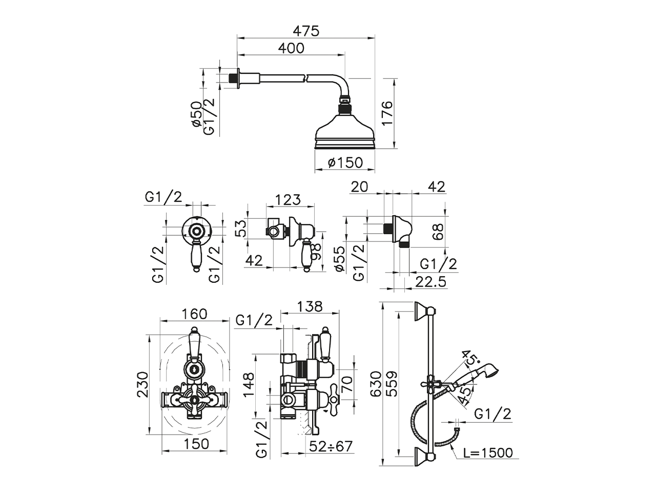 Completo miscelatore termostatico doccia incasso,miscelatore termostatico incasso 1/2",rubinetto d'arresto con uscita 1/2",deviatore 2 uscite,asta 56 cm con supporto scorrevole,braccio doccia con soffione L.400 mm in ottone,soffione tondo D.150 mm in Ottone,doccetta monogetto Classica in Ottone D.53 mm,presa d'acqua 1/2",flex Ottone 150 cm