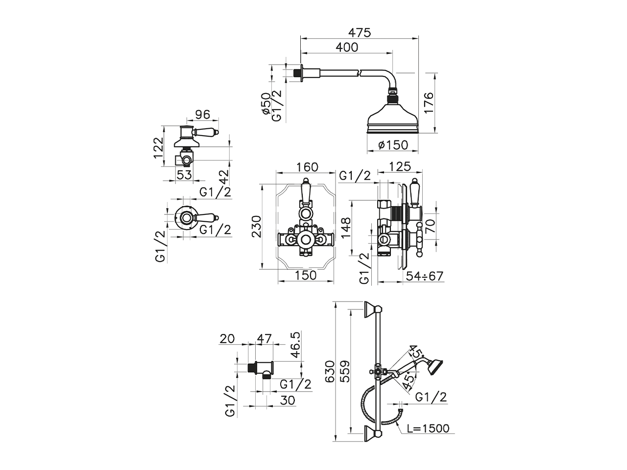 Completo miscelatore termostatico doccia incasso,miscelatore termostatico incasso 1/2",rubinetto d'arresto con uscita 1/2",deviatore 2 uscite,asta 56 cm con supporto scorrevole,braccio doccia con soffione L.400 mm,soffione tondo D.150 mm in ottone,doccetta monogetto Classica in Ottone D.78 mm,presa d'acqua 1/2",flex Ottone 150 cm