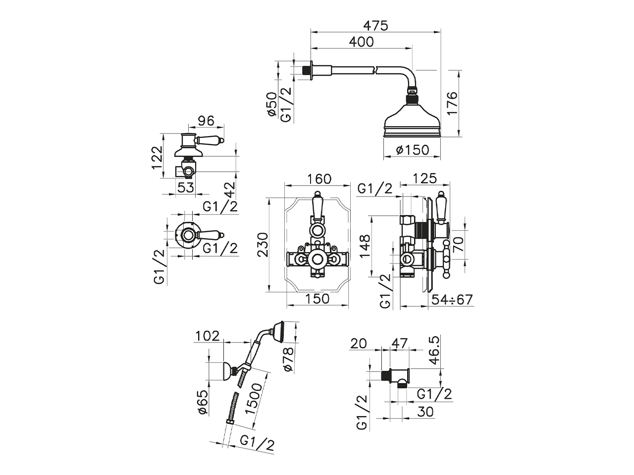 Completo miscelatore termostatico doccia incasso,miscelatore termostatico incasso 1/2",rubinetto d'arresto con uscita 1/2",deviatore 2 uscite,supporto doccetta snodato murale,braccio doccia con soffione L.400 mm,soffione tondo D.150 mm in ottone,doccetta monogetto Classica in Ottone D.78 mm,presa d'acqua 1/2",flex Ottone 150 cm