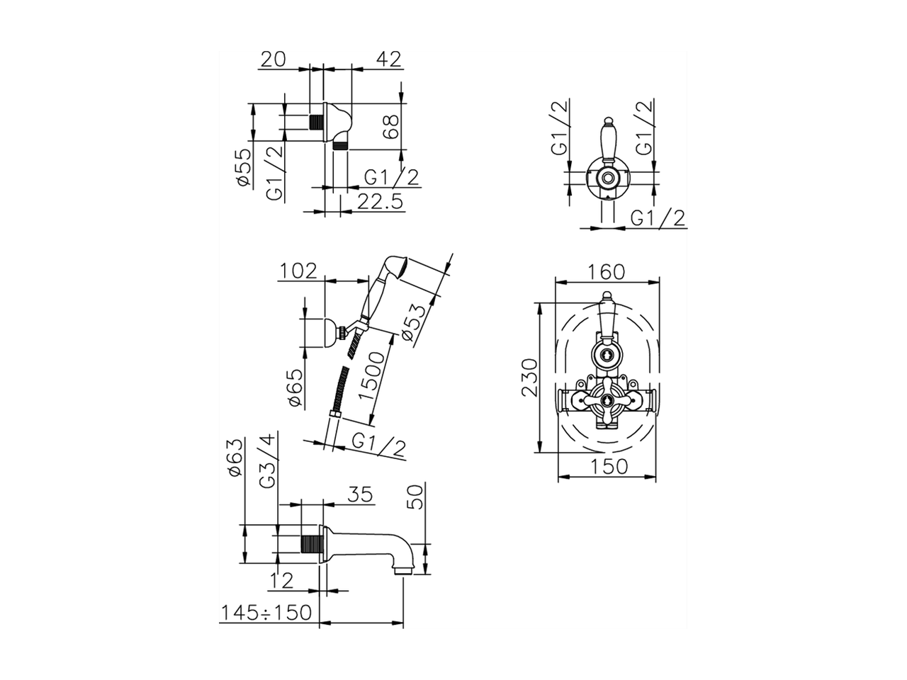Completo miscelatore termostatico vasca incasso,miscelatore termostatico incasso 1/2",rubinetto d'arresto con uscita 1/2",deviatore 2 uscite,supporto doccetta snodato murale,doccetta monogetto Classica in Ottone D.53 mm,bocca erogatoria L.150 mm 3/4 M,presa d'acqua 1/2",flex Ottone 150 cm