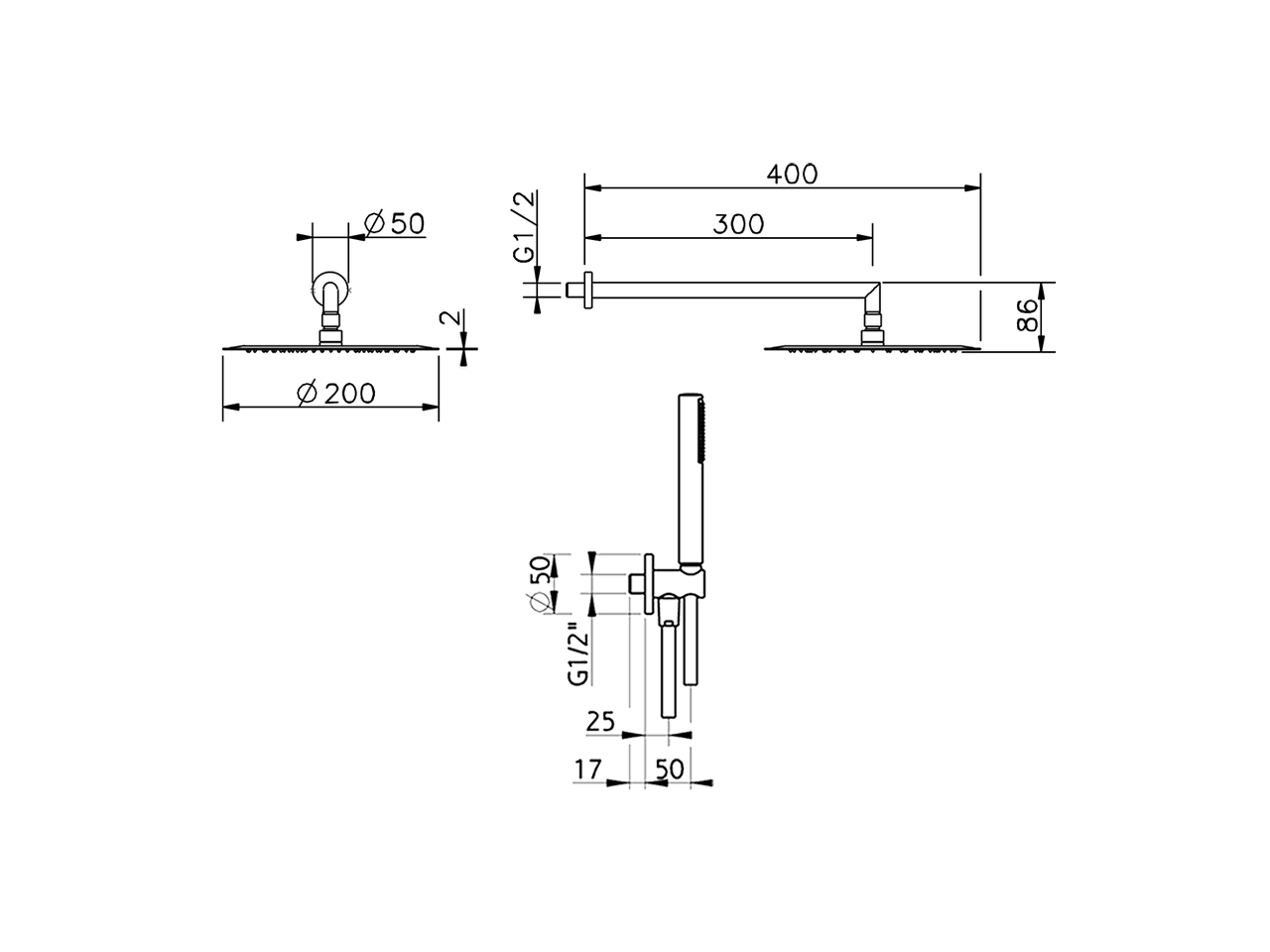 Kit braccio doccia con presa d'acqua,braccio doccia L.300 mm,soffione tondo D.200 mm SP.2mm in INOX,doccetta monogetto minimalista in ABS D.26 mm,presa d'acqua 1/2",flessibile liscio SILVERFLEX 150 cm
