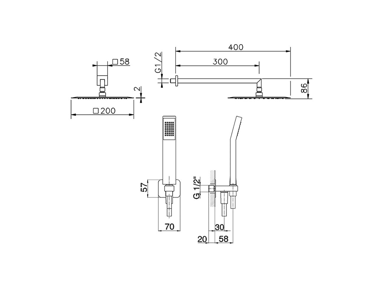 Kit braccio doccia con presa d'acqua,braccio doccia L.300 mm,soffione quadro 200x200 mm sp.2 mm in INOX,doccetta monogetto Quad 42x18 mm in ABS,presa d'acqua 1/2",flessibile liscio SILVERFLEX 150 cm