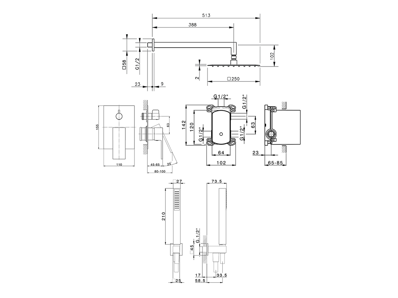 incasso,deviatore rotativo 2 uscite,supporto doccetta murale con presa d'acqua,braccio doccia L.400 mm,soffione quadro 250x250 mm sp.2 mm in INOX,doccetta monogetto minimalista quadra 27x27 mm ABS,presa d'acqua 1/2",flessibile liscio SILVERFLEX 150 cm