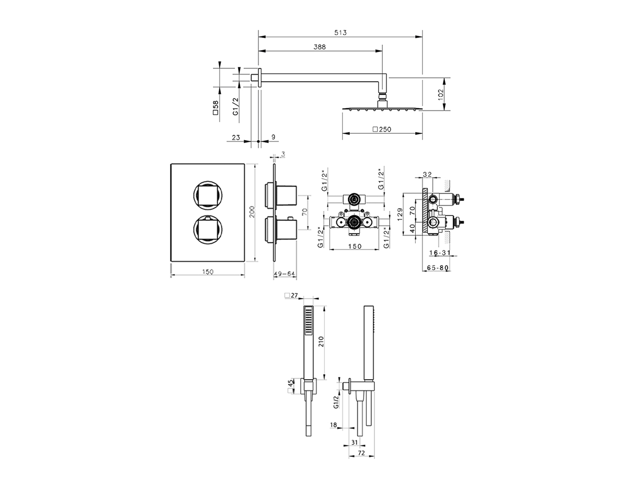 incasso,miscelatore termostatico incasso 1/2",deviastop 2 uscite,supporto doccetta murale con presa d'acqua,braccio L.400 mm,soffione quadro 250x250 mm sp.2 mm in INOX,doccetta monogetto minimalista quadra 27x27 mm ABS,presa d'acqua 1/2",flessibile liscio SILVERFLEX 150 cm