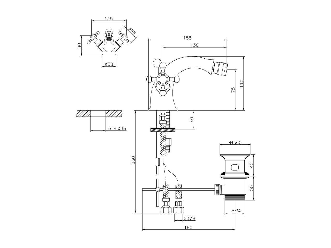 Miscelatore bidet,con scarico automatico 1"1/4,flex inox G.3/8"