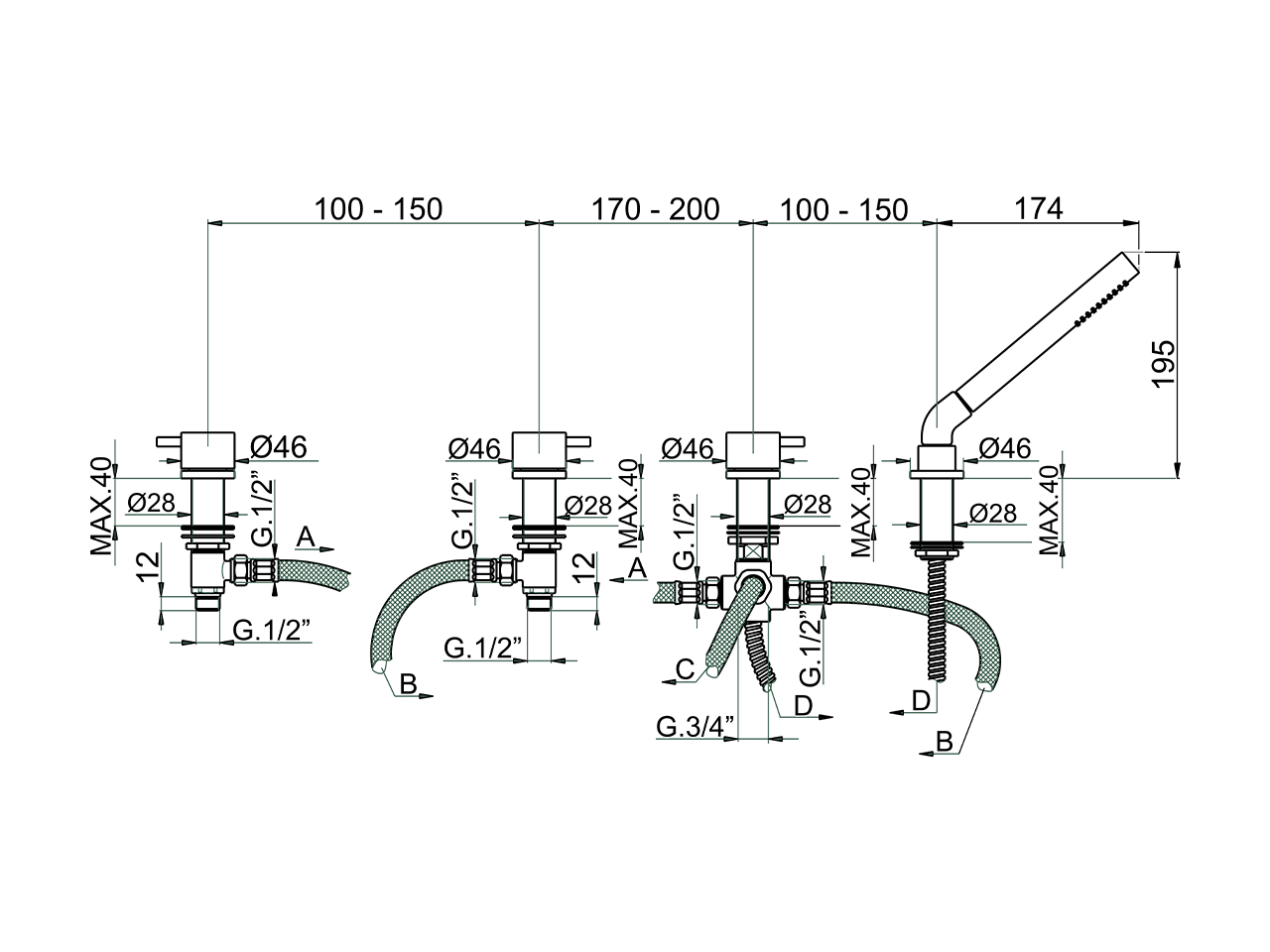 Miscelatore bordo vasca 4 fori,deviatore automatico,doccetta monogetto D.23 mm in Ottone,flex Ottone 175 cm