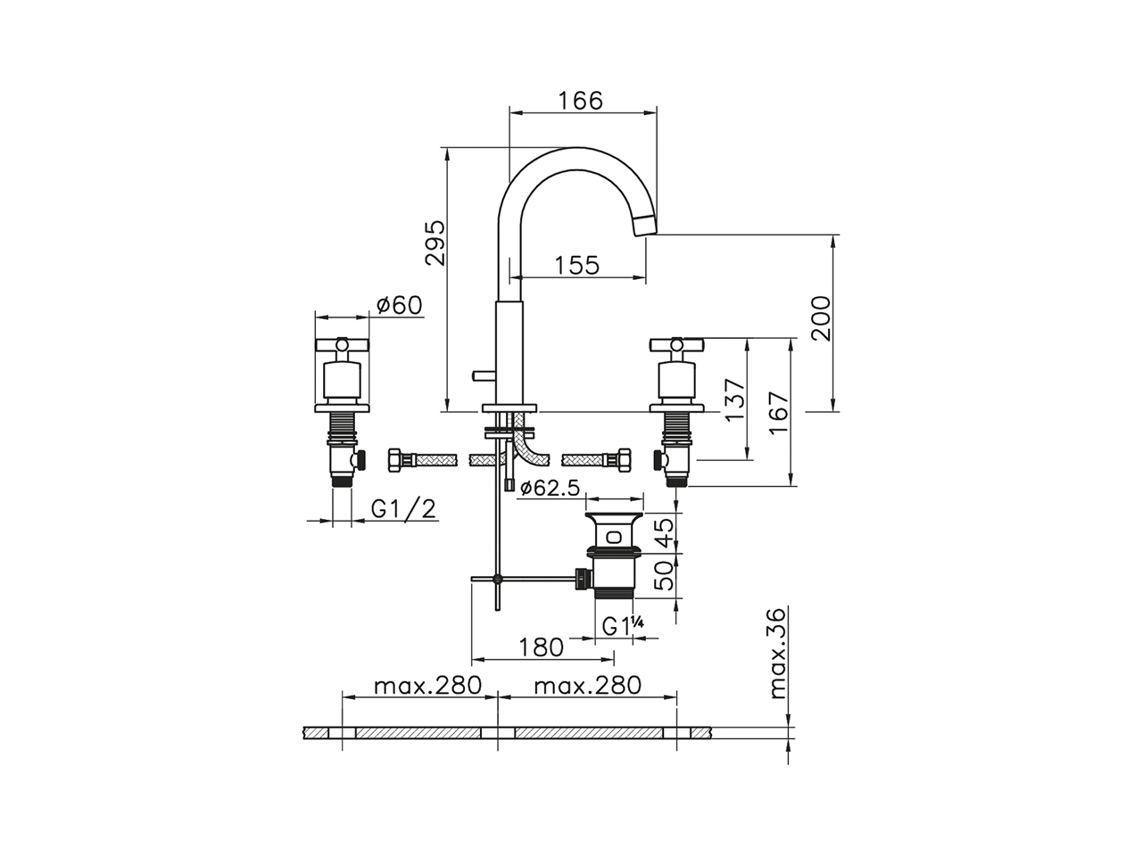 Miscelatore lavabo 3 fori,con scarico automatico 1"1/4
