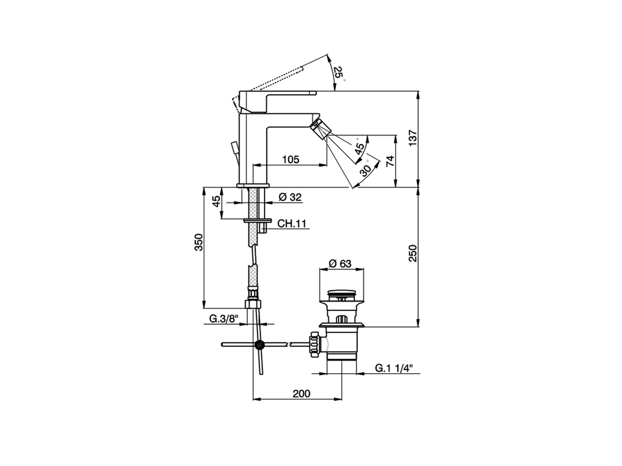 Miscelatore monocomando bidet,con scarico automatico 1"1/4,flex inox G.3/8"