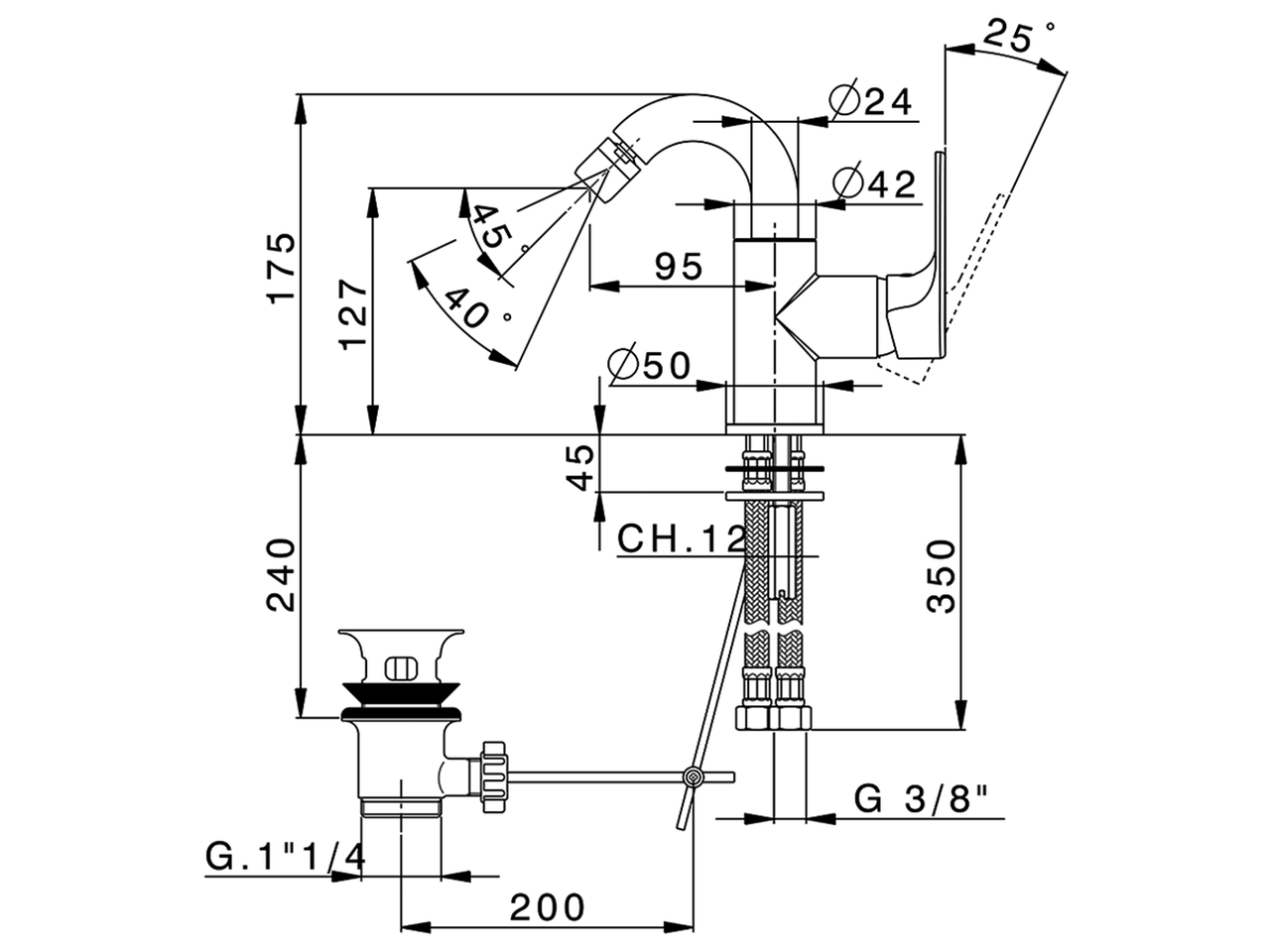 Miscelatore monocomando bidet EnergySave,bocca girevole,con scarico automatico 1"1/4,flex inox G.3/8"