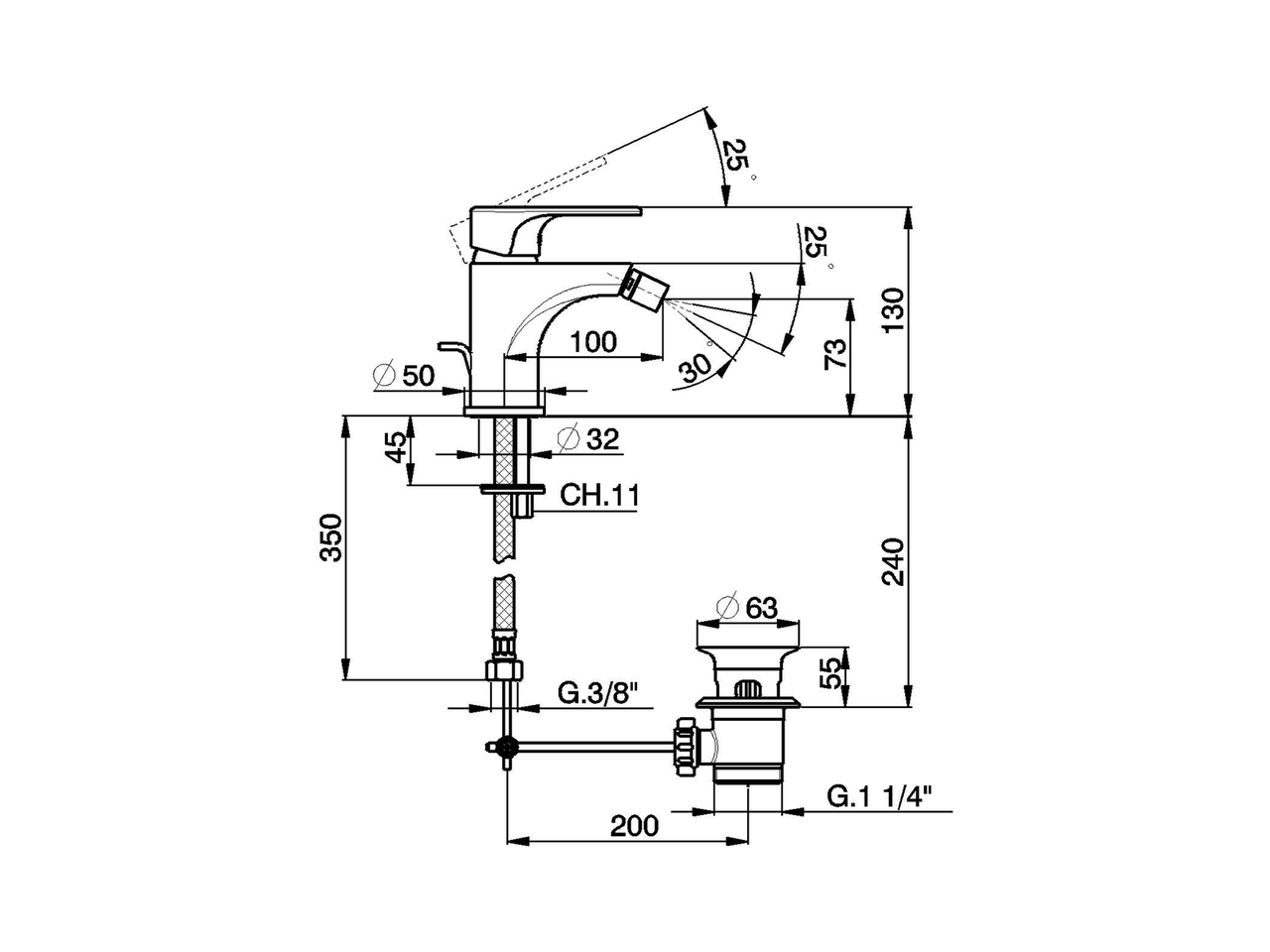 Miscelatore monocomando bidet,con scarico automatico 1"1/4,flex inox G.3/8"