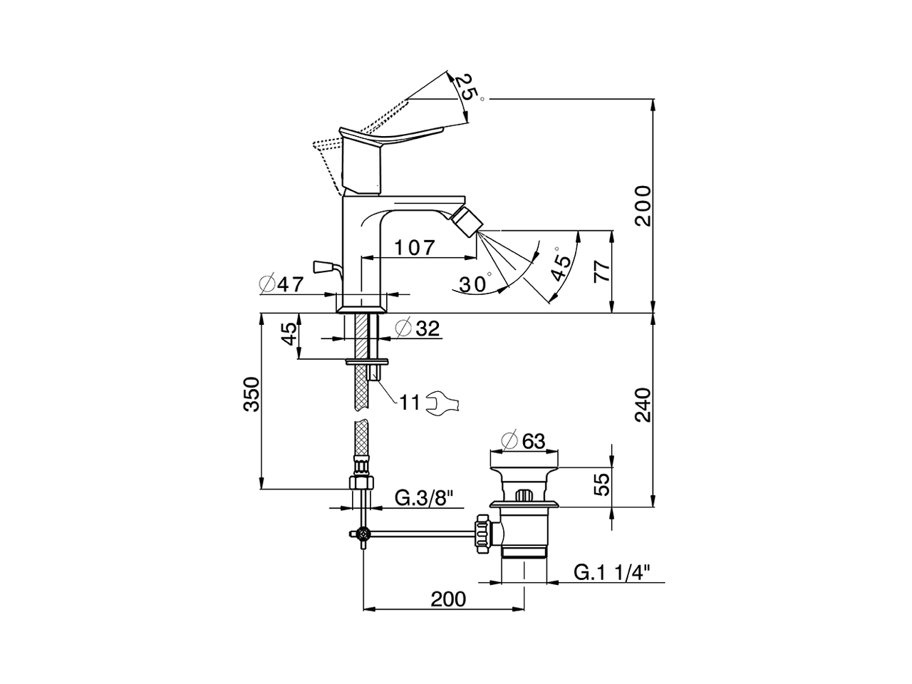 Miscelatore monocomando bidet,con scarico automatico 1"1/4,flex inox G.3/8"