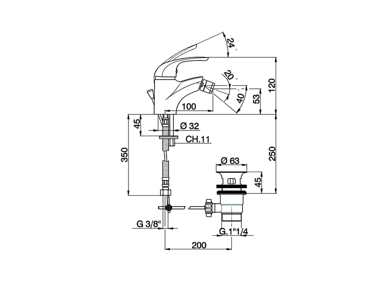 Miscelatore monocomando bidet,con scarico automatico 1"1/4,flex inox G.3/8"