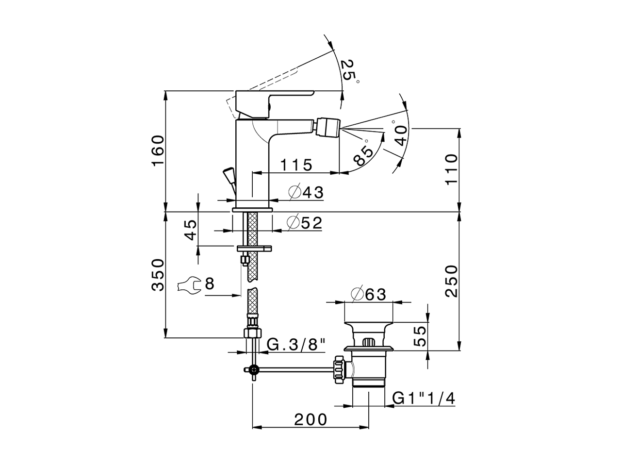 Miscelatore monocomando bidet,con scarico automatico 1"1/4,flex inox G.3/8"