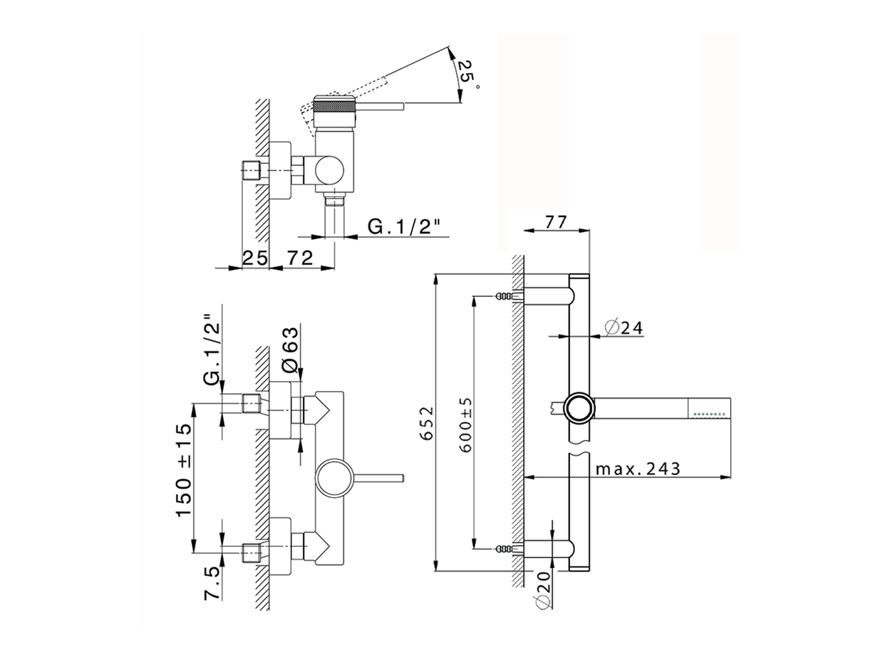Miscelatore monocomando doccia completo,asta saliscendi 60 cm con supporto scorrevole,doccetta monogetto minimale D.24mm in Ottone,flessibile liscio SUPREME 150 cm