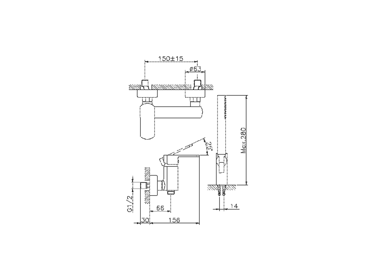 Miscelatore monocomando doccia completo,supporto doccetta snodato murale,doccetta monogetto minimalista D.26 mm in ABS,flessibile liscio SUPREME 150 cm