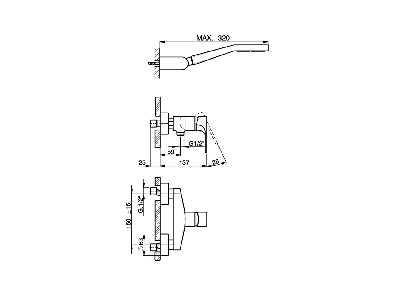 Miscelatore monocomando doccia completo,supporto doccetta snodato murale,doccetta monogetto D.100 mm in ABS,flessibile liscio SILVERFLEX 150 cm