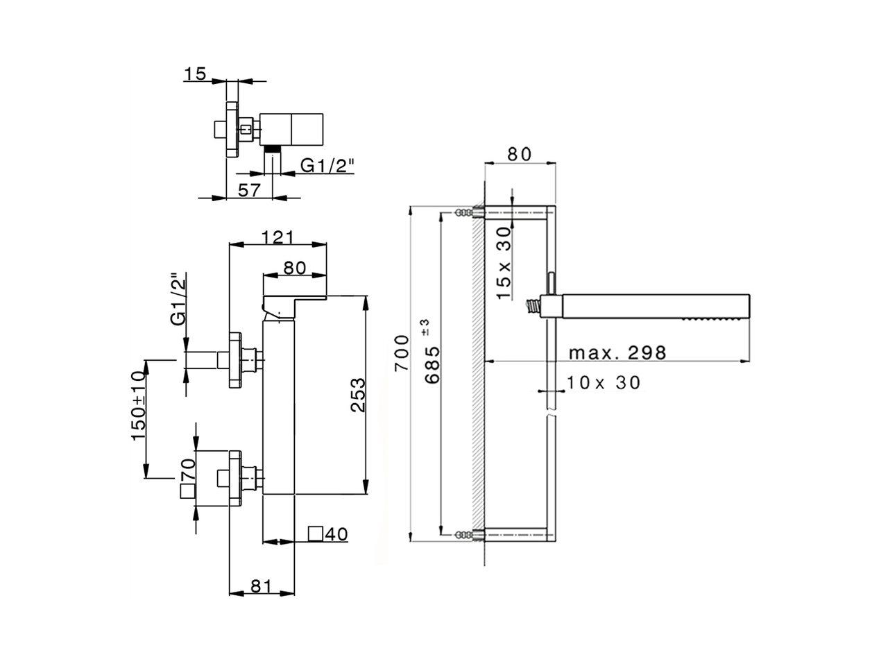 Miscelatore monocomando doccia completo,asta 70 cm con supporto scorrevole,doccetta monogetto minimalista quadra 27x27 mm ABS,flessibile liscio SILVERFLEX 150 cm