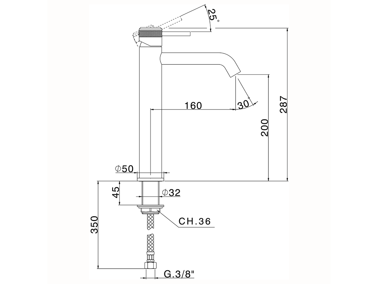 Miscelatore monocomando lavabo alto,senza scarico automatico,flex inox G.3/8"