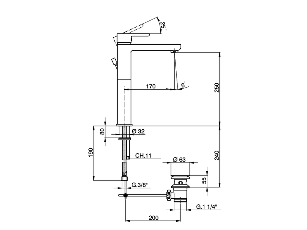 Miscelatore monocomando lavabo alto,con scarico automatico 1"1/4,flex inox G.3/8"