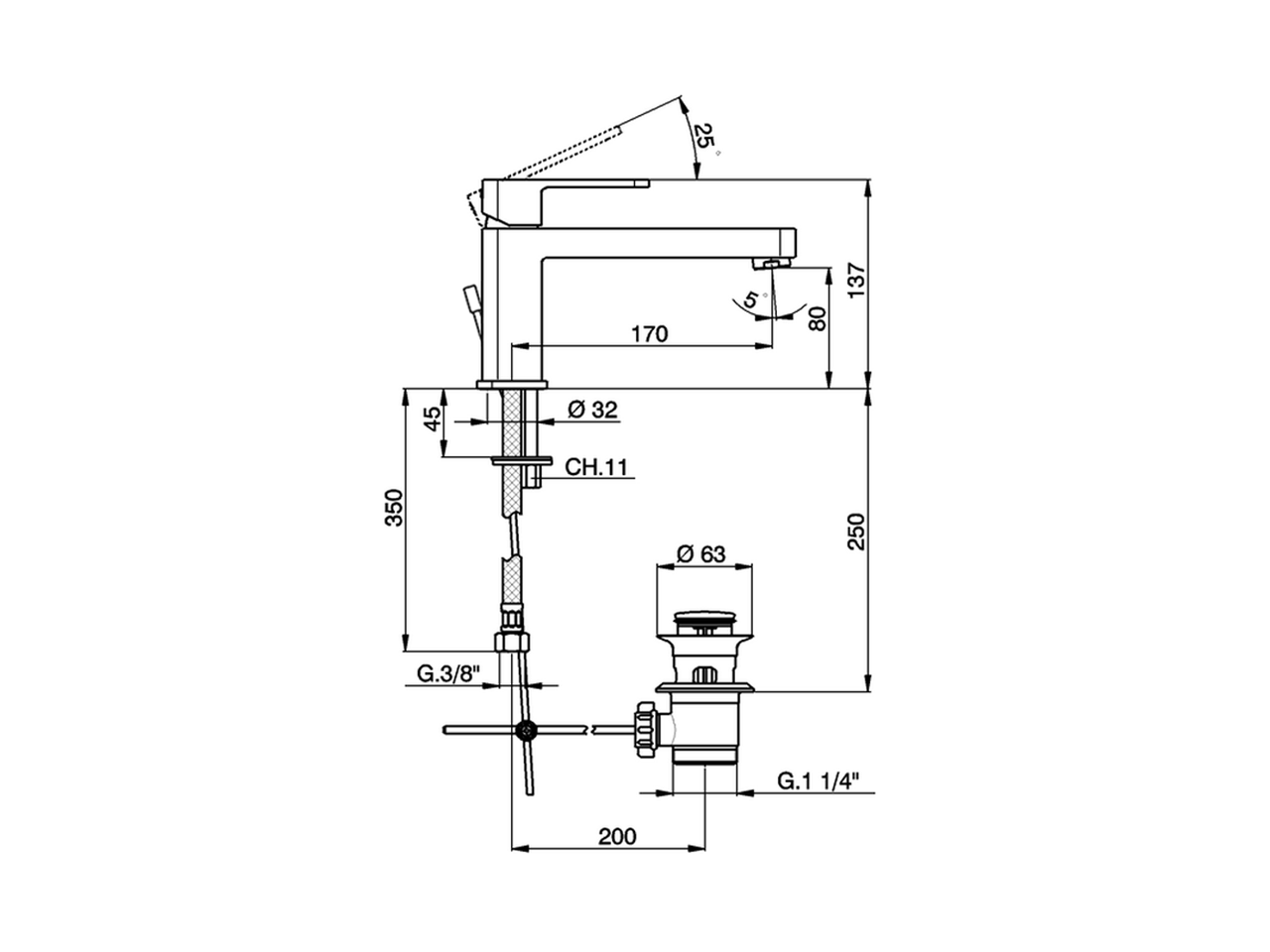 Miscelatore monocomando lavabo,con scarico automatico 1"1/4,flex inox G.3/8"