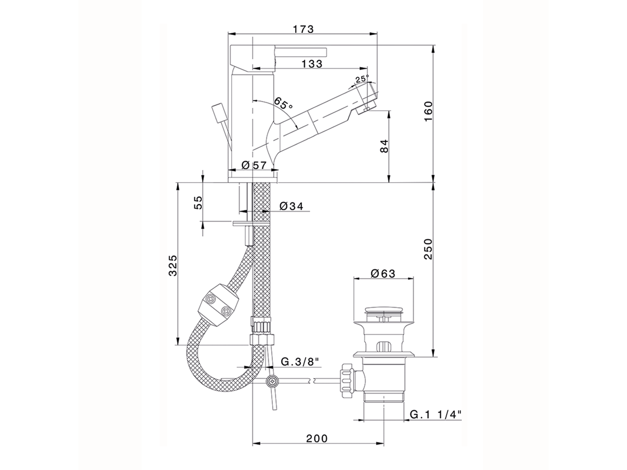 Miscelatore monocomando lavabo doccia estraibile,con scarico automatico 1"1/4,flex inox G.3/8"