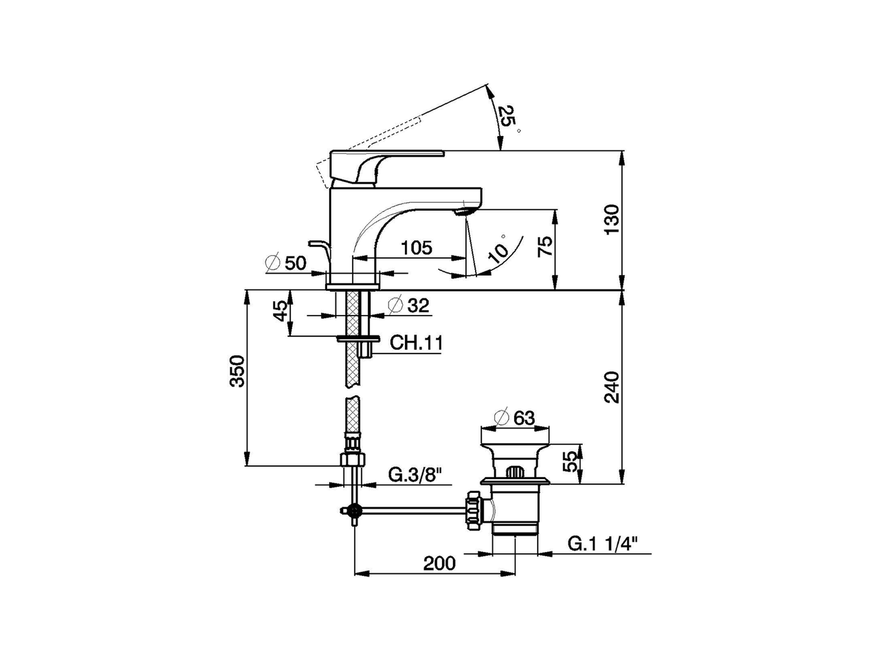 Miscelatore monocomando lavabo,con scarico automatico 1"1/4,flex inox G.3/8"